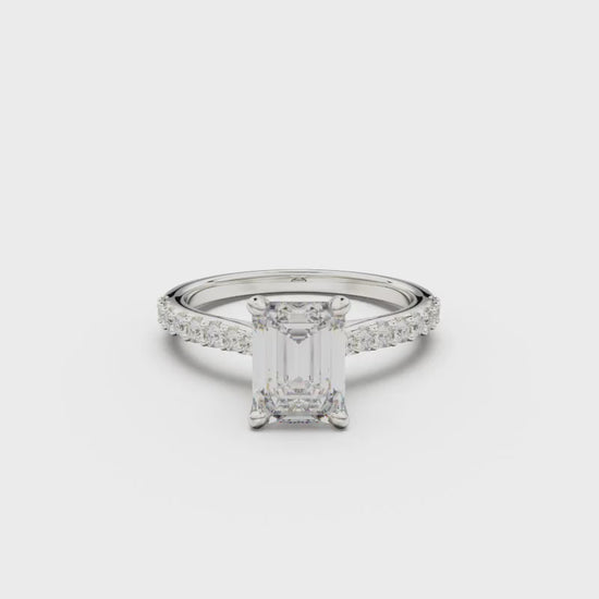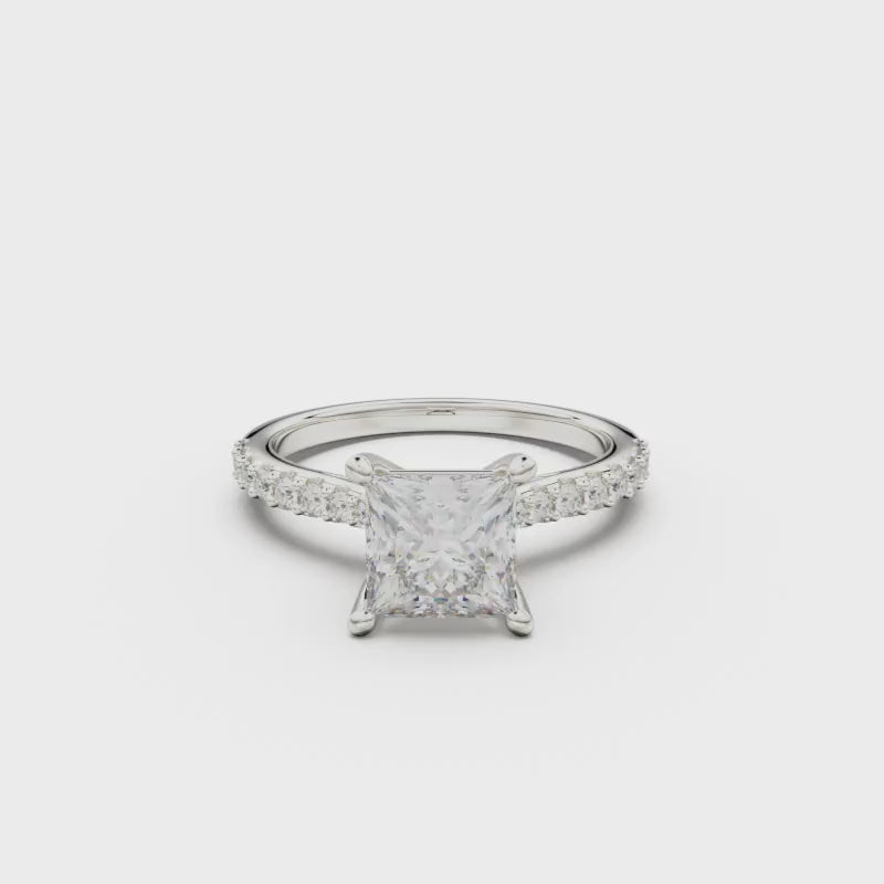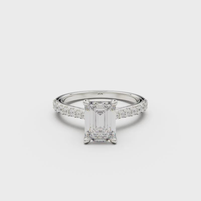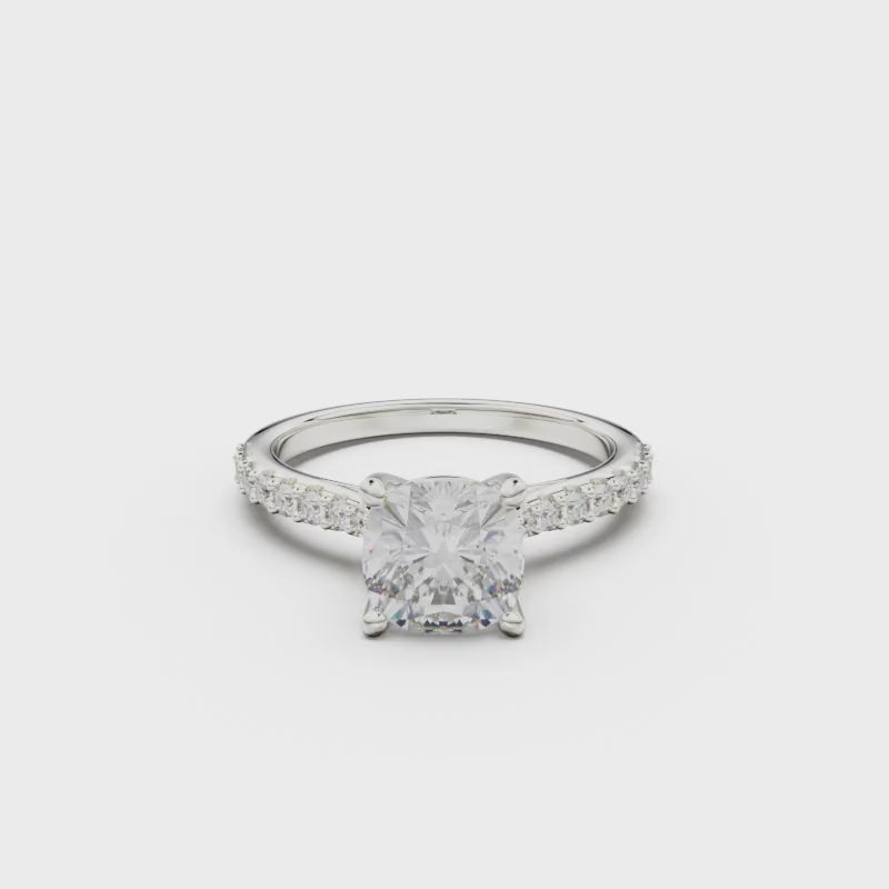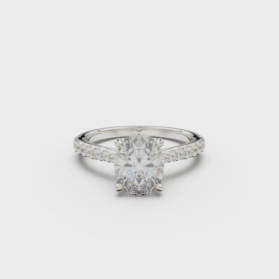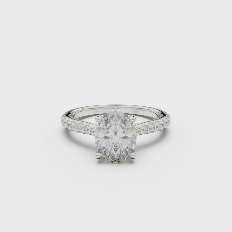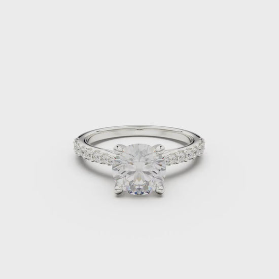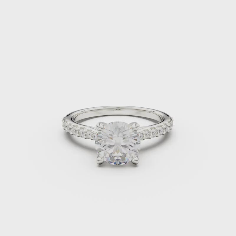 This 18K White Gold Pavé Engagement Ring is an elegant and romantic choice, showcasing a dazzling round diamond in the center and adorned with smaller diamonds on the sides. Its three-dimensional and delicate design is a perfect symbol of everlasting commitment and deep affection.